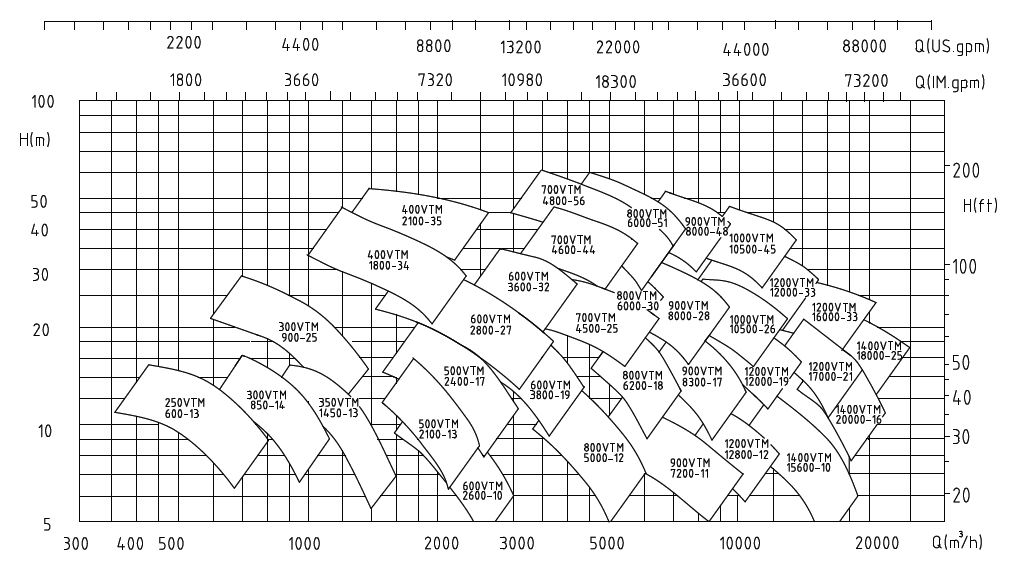 VTM系列立式長(zhǎng)軸透平泵性能范圍